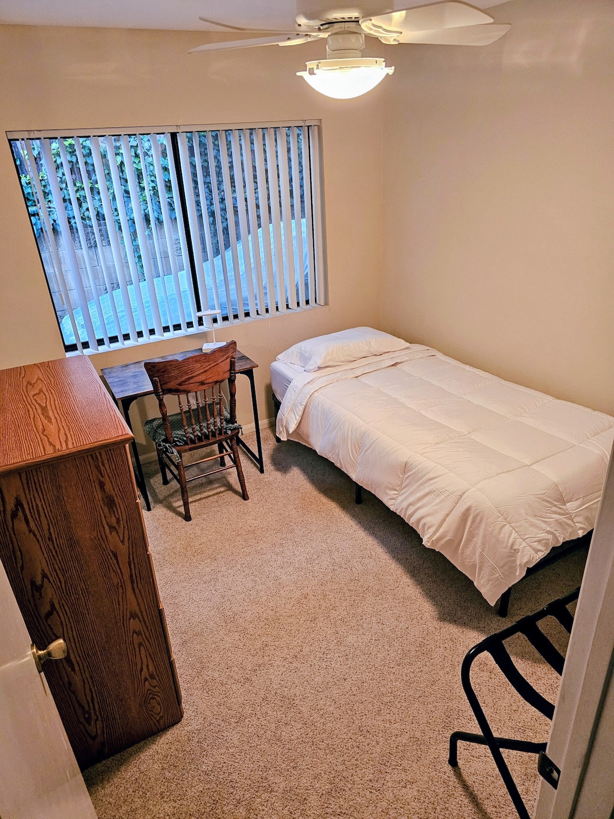 To jak pokój hotelowy lub minimalistyczne studio. Cały obiekt to: – JEDEN kompaktowy pokój - Łazienka - Prywatne wejście Nie ma kuchni ani salonu. Jest połączone z moim domem. W pokoju znajduje się aksamitna kanapa, którą można przekształcić w duże łóżko. Łóżko jest niezwykle wygodne dzięki 2-calowemu materacowi. Będzie gotowe jako łóżko po przyjeździe i łatwo przekształcić je w kanapę. Jest biurko, lodówka/zamrażarka, ekspres do kawy, kawa, kubki, przybory, talerze, miski, pralka/suszarka i detergent do prania.