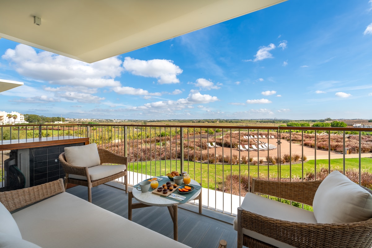 Apartament z 1 sypialnią w 5-gwiazdkowym ośrodku Herdade dos Salgados, idealny dla par z maksymalnie 1 dzieckiem, szukających komfortowych i relaksujących wakacji w pobliżu natury, plaży i pola golfowego. Apartament znajduje się na drugim piętrze, ma duży balkon (17 m2), ogromny salon (44 m2), doskonały widok na 7 basenów i znajduje się w ośrodku z dużymi terenami zielonymi (750 palm i 2500 drzew oliwnych). Ośrodek ma bezpośrednie połączenie z Salgados Golf i plażą.