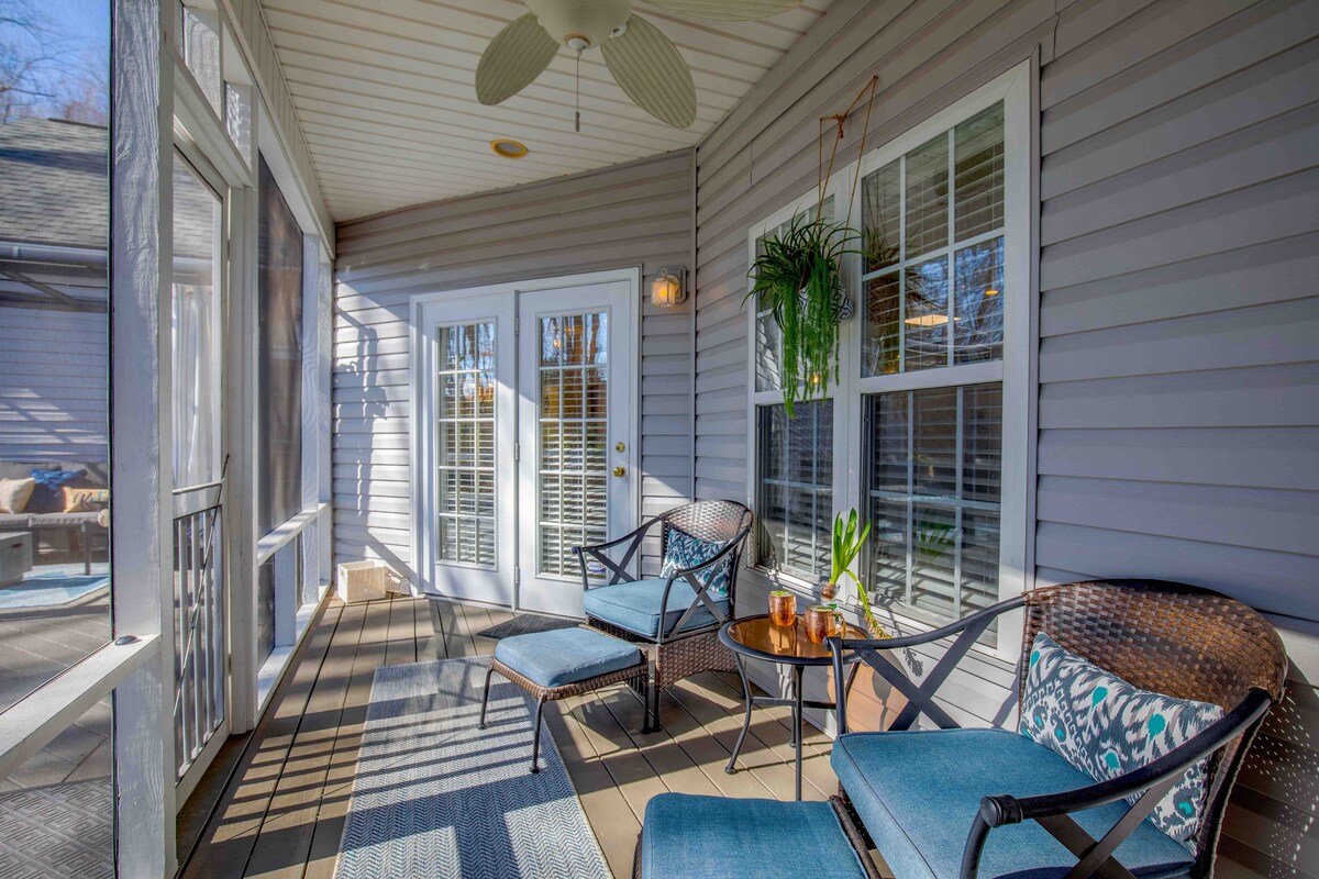 Nowo odnowiony dom z dwiema sypialniami położony w centrum Simpsonville, w odległości spaceru od doskonałej różnorodności restauracji, sklepów i ciekawych miejsc. Przestronny prywatny balkon, prowadzący z głównej sypialni, wychodzi na spokojne podwórko... świetne miejsce na relaks na świeżym powietrzu! Kuchnia jest w pełni wyposażona do przygotowywania wspaniałych posiłków. Nasz dom jest dokładnie i profesjonalnie czyszczony i dezynfekowany. ***Uwaga: pociąg kursuje w południe i późno w nocy.