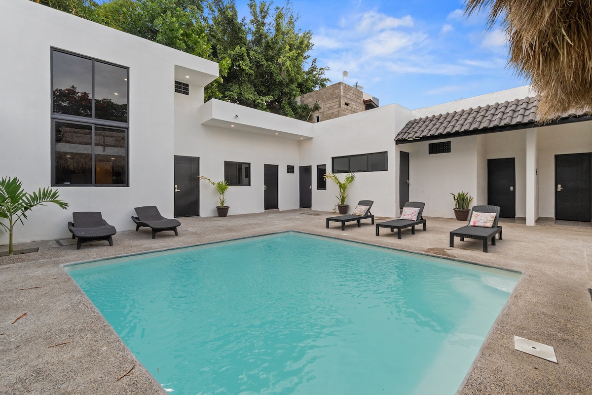 Charming condo just 3.5 blocks to the beach, 1 to the Golden Zone, 1 to Restaurant Row (5 de Mayo), & 6.5 from downtown. Relax on your private terrace, fire up the charcoal grill, or grab the included beach gear for a day in the sun. With fast WiFi, a dedicated workspace, inverter A/C, and solar panels, the condo offers a comfortable, eco-friendly stay in a vibrant, walkable neighborhood.
