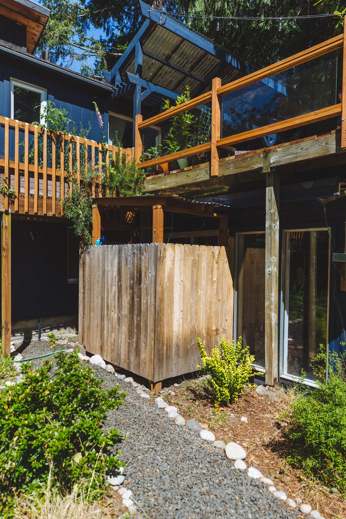 Full garden views, bright and modern secluded "guest house" 5 minutes off the highway and 10 minutes from the ferry in western Bremerton. The space is a standalone unit detached from our main house tucked off the main street, nestled amongst the cedars and firs along Mud Bay connecting to Puget Sound. The room has a full 270 degree view on the gardens and trees, queen size murphy bed, fridge, sink, microwave, wood stove and bathroom, complete with 16" outdoor rain shower.