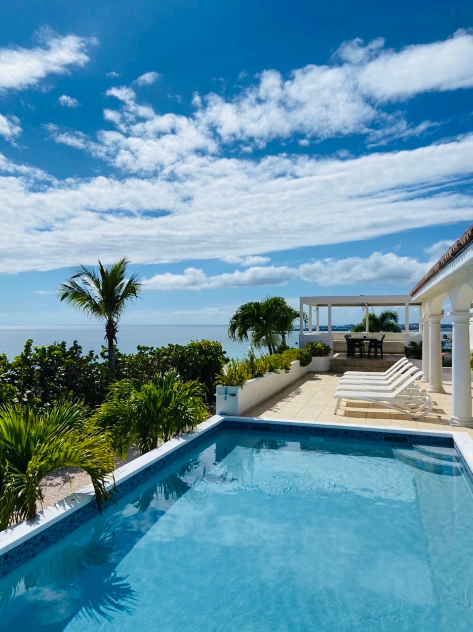Villa principale : 3 chambres et 2 salle de bains. Puis avec leur entrée indépendante, avec quelques marches : 1 grande chambre et 1 studio. Magnifique vue mer à 200° sur les îles de Saba, St Eustache, St Kitts, Nevis et St Barth ainsi que le lagon de Simpson Bay. Grandes terrasses, couvertes et non couvertes. Terrain arboré et grand parking pour 5 voitures, portail , piscine privée. Entrée privée. Aucun vis à vis !