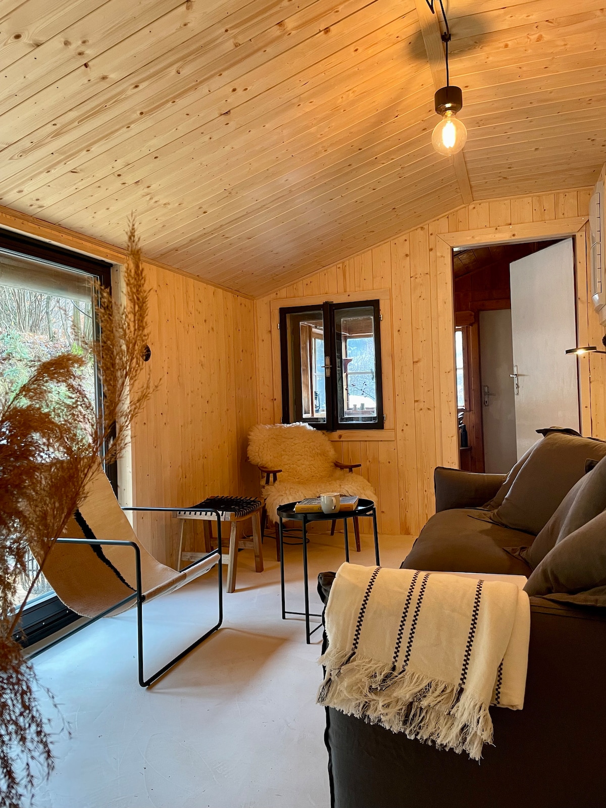 Nasza drewniana chatka znajduje się między dwiema rzekami. Jest to więc wspaniałe i bardzo spokojne miejsce na pobyt. Na dole znajduje się główny pokój z nowoczesną kuchnią, lodówką, pralką, zmywarką... jest kominek, który może ogrzać całą chatkę. Duży taras to świetne miejsce, w którym można delektować się filiżanką herbaty lub kawy. Ogród i otoczenie to naprawdę świetne miejsce dla dzieci. A jeśli pogoda będzie zła, mogą się bawić na huśtawce w domku... :-)