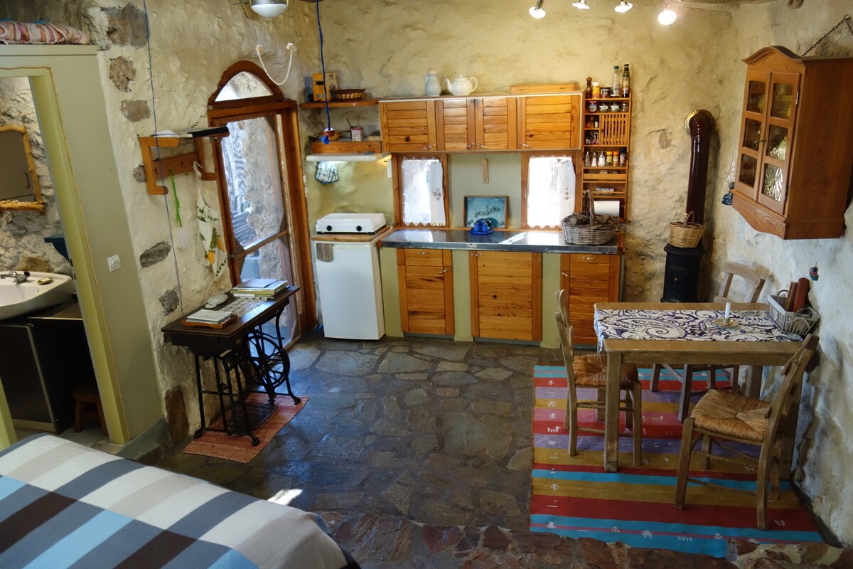 Ideally located, both close to Kardamyli but also private. A remarkable guesthouse on two levels with cathedral ceilings and an exposed wood vaulted roof. With it's own entrance. There is a sitting area with fireplace and a sofa that sleeps 1-2, a kitchenette, spacious bathroom with shower, eating area and an exit to a private terrace with outdoor shower and sitting area. Upstairs a king size bed with spectacular views of the sea and mountains. A unique place with a style all its own.