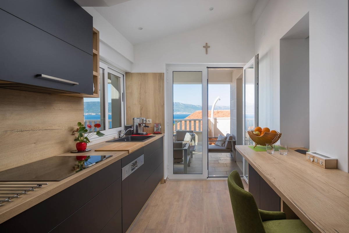 Royal to nowy, nowoczesny i luksusowy odnowiony apartament z jacuzzi, 50 metrów od plaży. Ma 50 metrów kwadratowych i 30 metrów kwadratowych tarasu. Posiada 2 sypialnie, salon, w pełni wyposażoną kuchnię z jadalnią, łazienkę z dużym prysznicem, sprzęt do grillowania, garaż (1 samochód), telewizor z płaskim ekranem w każdym pokoju i bezpłatne Wi-Fi. Oferuje duży taras z widokiem na otwarte morze i okoliczne wyspy. W pobliżu można nurkować. Trogir znajduje się 5 km, a lotnisko w Splicie 8 km od apartamentu.