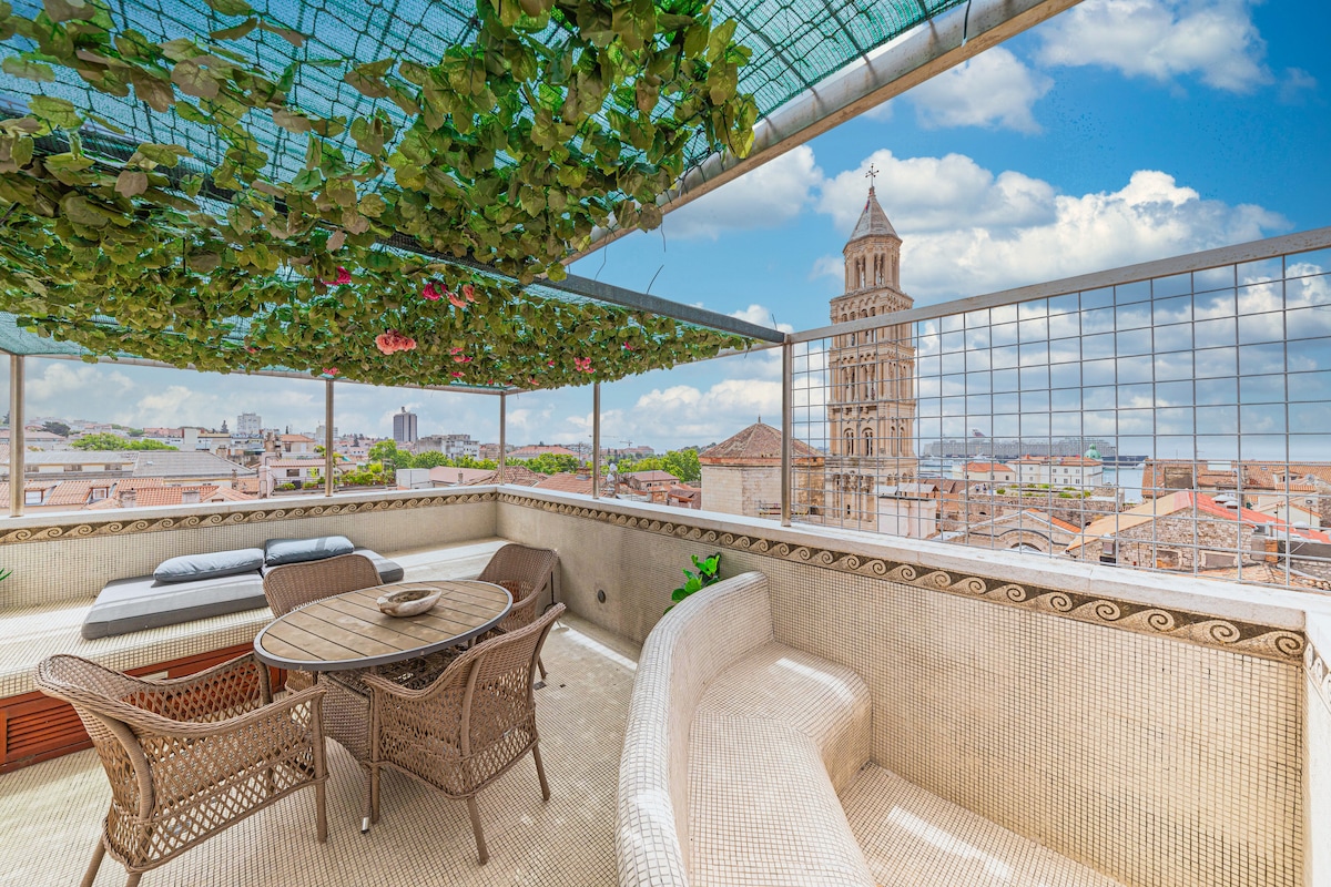 Apartament typu penthouse w pobliżu centrum miasta z niesamowitym widokiem na Pałac Dioklecjana, port i przystań. Sam pałac, mający 1700 lat, znajduje się znajduje w odległości krótkiego, 5-minutowego spaceru od apartamentu i jest wpisany na listę UNESCO. Wypełniony mnóstwem małych kawiarni i malowniczych restauracji oferuje rozrywkę i chorwacką kuchnię w pełnej krasie. Plaże znajdują się niedaleko, 15 minut spacerem od apartamentu po obu stronach portu. Na parterze znajduje się supermarket, a w odległości 100 m od ulicy znajduje się apteka.