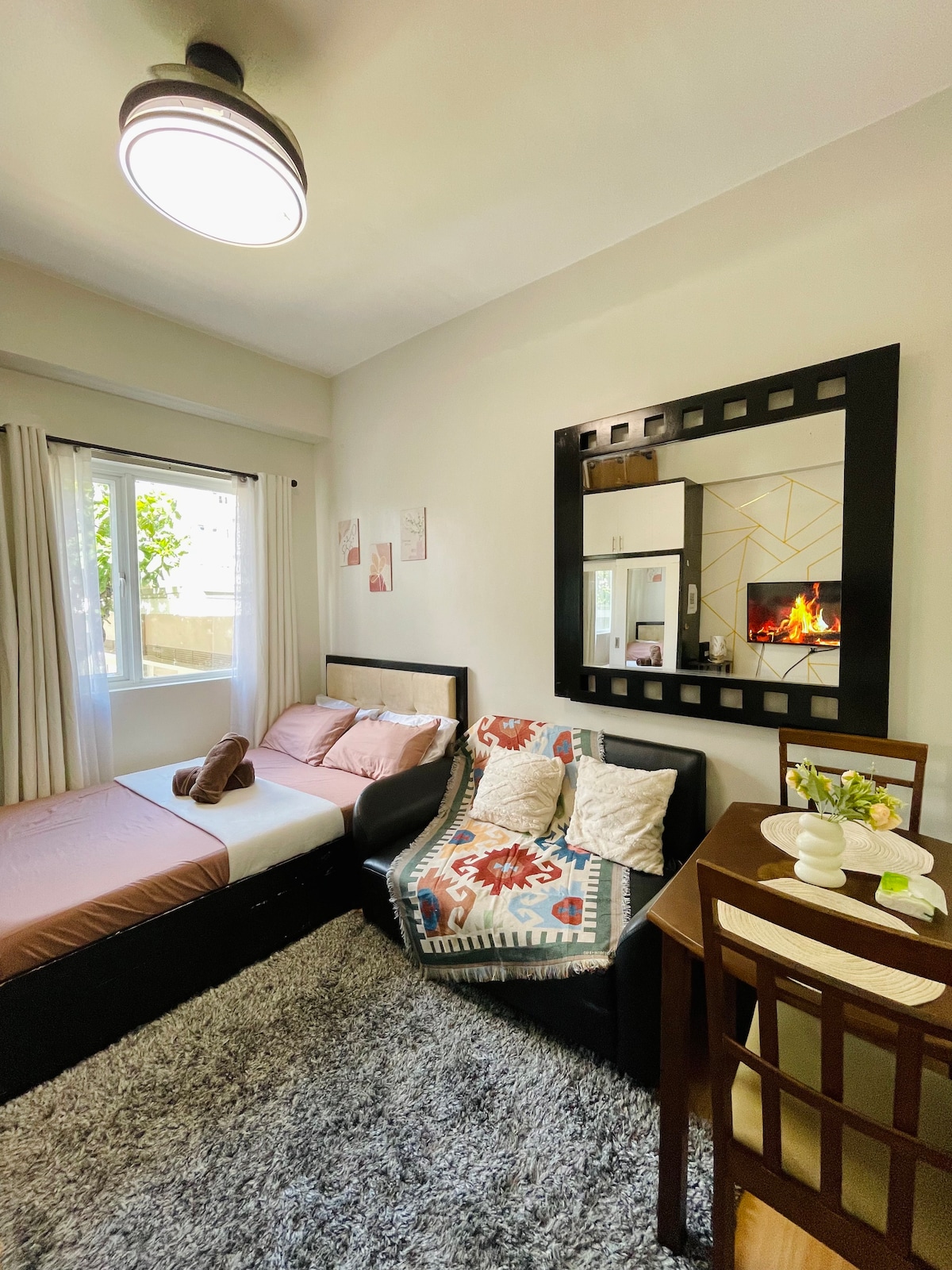 Zrelaksuj się ze znajomymi i bliskimi w PRZYTULNYM miejscu Ziamazing 's Home, hotelu inspirowanym kondominium. Doświadcz wspaniałej atmosfery i fajnych udogodnień. 2BR corner unit with 2 Balconies (53 mkw.) Living Sofa 49" Smart TV + Netflix Szybkie połączenie WI-FI Klimatyzowana sypialnia Master z łóżkiem typu queen size + wysuwanym Klimatyzowany pokój gościnny z pojedynczym łóżkiem + wysuwanym Prysznic na ciepło i na zimno, 4-osobowa jadalnia Kuchnia z naczyniami do gotowania Lodówka, kuchenka mikrofalowa, kuchenka do ryżu Induction Stove Board Games