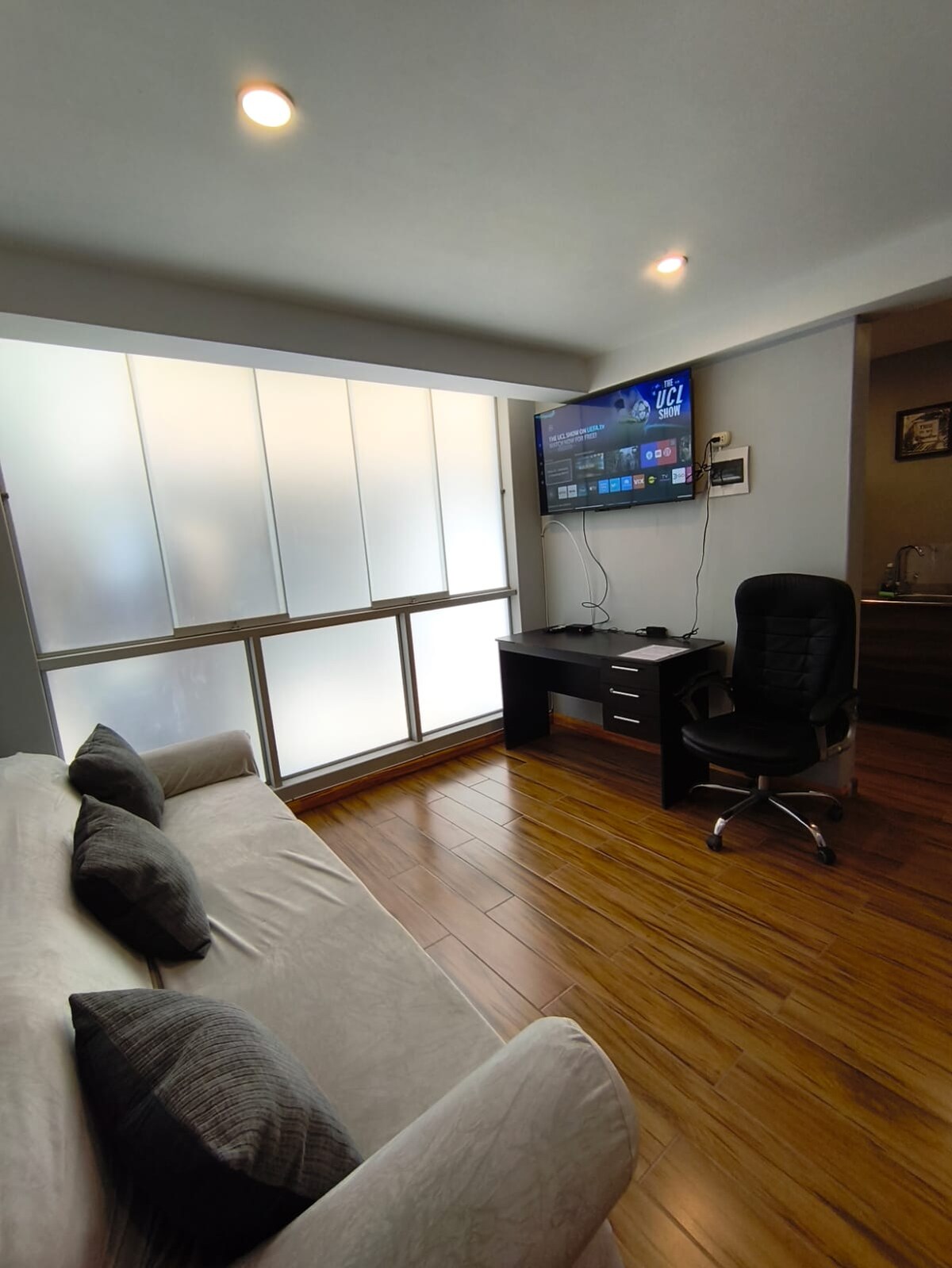 Nowoczesna antresola z tarasem i grillem! Wyposażona w biurko idealne do pracy zdalnej z szybkim Wi-Fi, telewizorem 65', pokój z dwuosobowym łóżkiem. Pokój dzienny, aneks kuchenny ze wszystkim, czego potrzebujesz do gotowania. Apartament znajduje się na 3. piętrze, więc konieczne jest korzystanie ze schodów. Taras z grillem i widokiem na ulicę Położony w dzielnicy José Luis Bustamante, 5 minut od U. San Martín de Porres, Tecsup, Mall Aventura Plaza, OutletArauco i 15 minut od Centrum Historycznego
