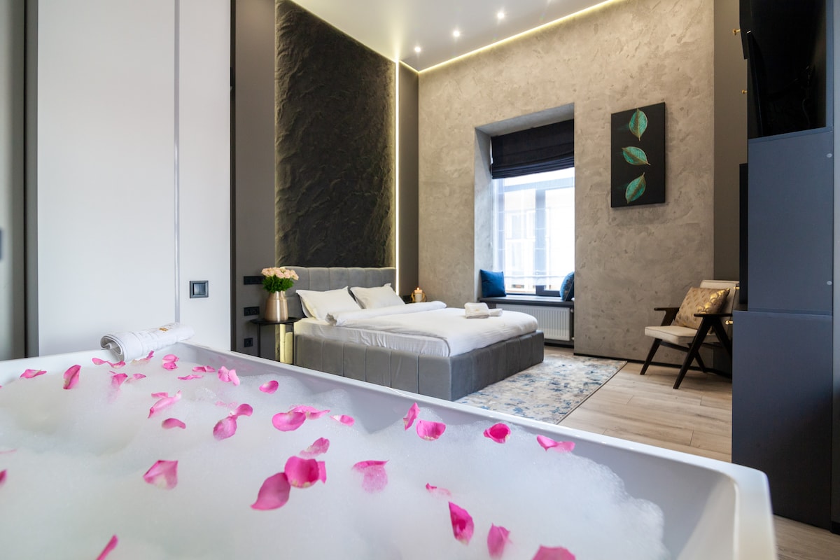 Położony w samym SERCU Lwowa, witamy Cię w naszym stylowym apartamencie. Kilka kroków od głównego placu i Opery! Szklana podłoga mezannina, wanna bezpośrednio w sypialni na ścianie i sauna są idealne na wyjątkową i romantyczną chwilę! Restauracja, bar i kawiarnia znajdują się mniej niż 1 minutę pieszo!