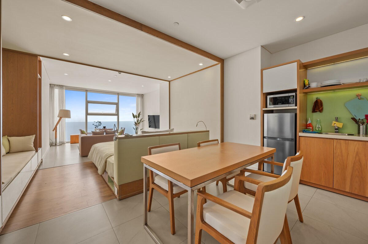 Ten przytulny apartament z 2 sypialniami na 10. piętrze hotelu Fusion Hotel (lub hotelu Signature By M Village Beachfront Hotel) znajduje się zaledwie kilka kroków od plaży My Khe. Zaprojektowane w nowoczesnym stylu studio, posiada w pełni wyposażoną kuchnię oraz część dzienną i jadalną. W domu znajduje się łóżko typu King Size oraz oddzielna mała sypialnia z łóżkiem piętrowym. Idealne miejsce dla par, osób pracujących zdalnie lub rodzin (maksymalnie 4 osoby), które szukają relaksującego pobytu przy plaży w Da Nang.