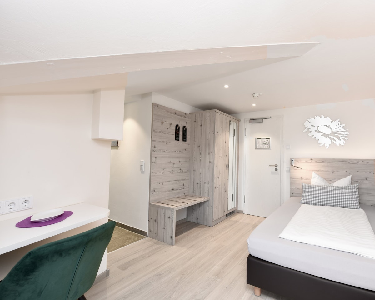 Pokoje jednoosobowe „Zugspitzblick” są wyposażone w prysznic lub wannę, umywalkę, suszarkę do włosów, telewizję kablową, radiobudzik i bezpłatne Wi-Fi. Nasze komfortowo wyposażone pokoje jednoosobowe „Zugspitzblick” są zorientowane na południe i posiadają balkon ze wspaniałym widokiem na alpejskie krajobrazy Allgäu oraz Zugspitze, najwyższą górę w kraju. Przestronna część wypoczynkowa zapewnia dodatkowe miejsce do pracy i relaksu.