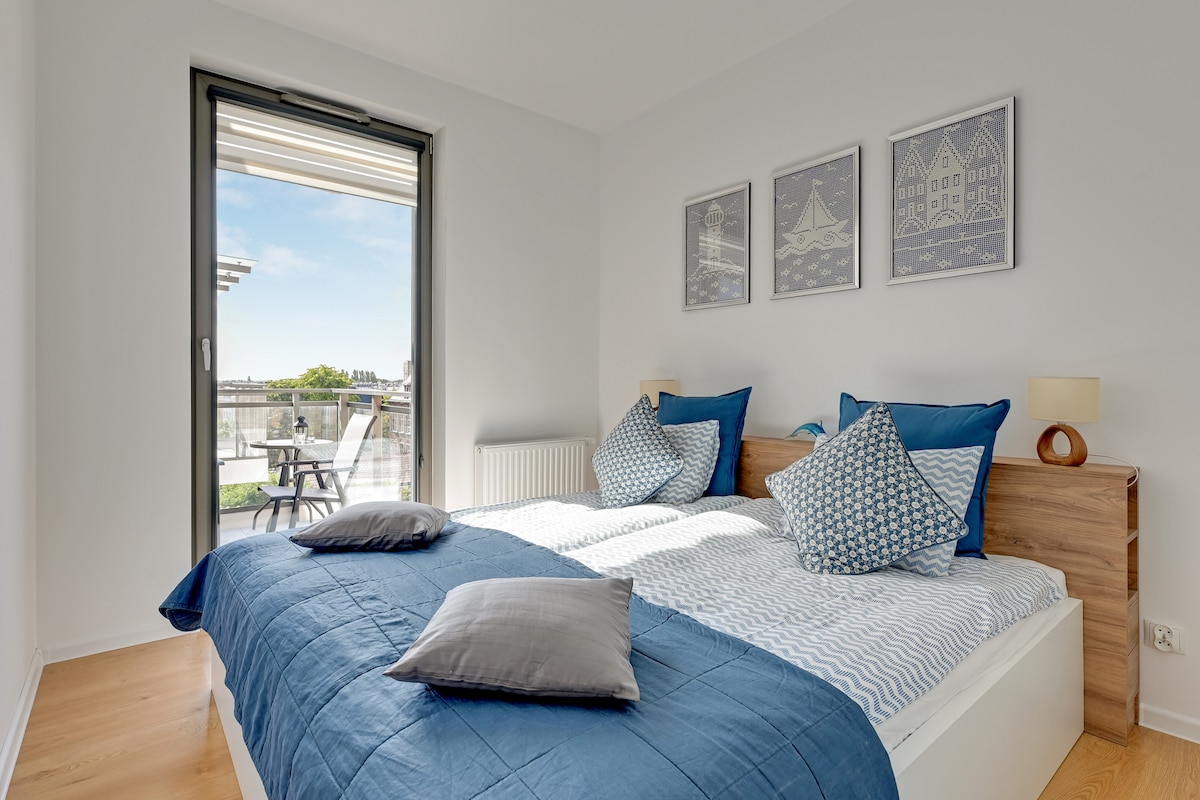 Wyjątkowy apartament z niepowtarzalnym widokiem na Stare Miasto w Gdańsku, który można podziwiać z przestronnego, umeblowanego tarasu. Apartament znajduje się w bliskim sąsiedztwie rzeki Motława. Przestrzeń w pełni spełni oczekiwania wymagających klientów, na wyposażeniu apartamentu znajdują się: klimatyzacja, ekspres do kawy oraz smart TV. Dodatkowo do dyspozycji gości jest siłownia dostępna w kompleksie (bezpłatnie).