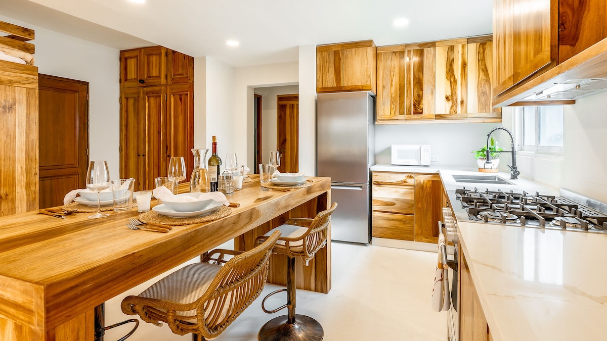 Ten stylowy apartament na drugim piętrze, zaledwie 5 minut od plaży, oferuje 2 sypialnie z łóżkami typu queen, 2 pełne łazienki, klimatyzację, Wi-Fi, w pełni wyposażoną kuchnię, bezpłatny parking i całodobową ochronę. Wysoki sklepiony sufit sprawia, że jest chłodniej i daje piękne poczucie przestrzeni. Z naszego przestronnego balkonu można cieszyć się bryzą i, w zależności od pory roku, częściowym widokiem na ocean. Jesteśmy w 100% przyjaźni dla gości, a nasz opiekun Isidro jest zawsze dostępny, aby Ci pomóc.