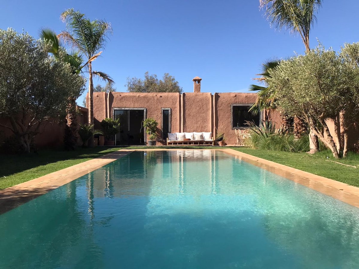 Maison d'architecte située à la campagne typique de la région de Marrakech, pour les amoureux de la nature . Jardin magnifique, légumes du potager et poulailler. Il y a une piscine privative. Le tout sur un terrain de 5000m2. Un gardien est présent dans la propriété et une pisciniste nettoie la piscine 2 fois par semaine l'hiver et tous les jours l'été. L'eau et l’électricité sont des ressources sacrées à la campagne :) Le respect de l'environnement est important.