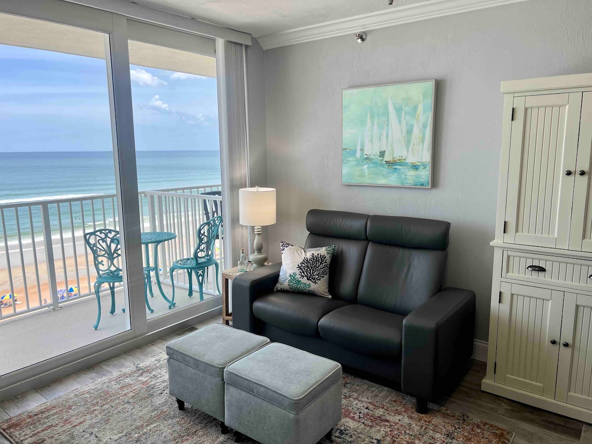 Nowość! Witaj w Daytona Beach Bliss! Rozkoszuj się naszym nowo wyremontowanym apartamentem z jedną sypialnią i niesamowitymi widokami na ocean z 7. piętra. Zobacz wschód słońca na balkonie, a może nawet dostrzeżesz delfiny! Zrelaksuj się na plaży, jesteśmy zaledwie kilka kroków od naszego prywatnego dostępu do plaży! Możesz też spędzić trochę czasu w podgrzewanym basenie przy oceanie i w jacuzzi. Ręczniki plażowe, lodówka, dwa leżaki i parasol plażowy są do Twojej dyspozycji!