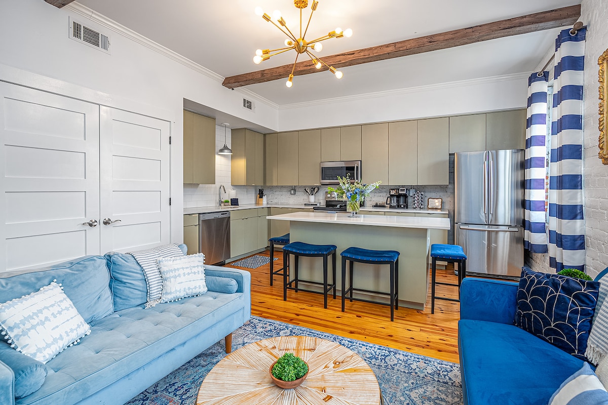 Zarezerwuj to miejsce, jeśli naprawdę chcesz mieć WSZYSTKO! Czyste linie i nowoczesne aktualizacje, a także DROOL-WORTHY, ponad 100-letnie, sercowe podłogi sosnowe i odsłonięte ceglane kominki. Nasz wiktoriański dom z 1887 roku został pięknie odnowiony i ozdobiony lokalnymi dziełami sztuki, niebiesko-zielonymi sufitami i stylowym wystrojem, który zachwyci nawet najbardziej zmęczonych podróżników i zachęci ich do odkrywania naszego NIESAMOWITEGO miasta. Ten NIESAMOWITY apartament na piętrze znajduje się rzut beretem od FAB Forsyth Park w samym sercu dzielnicy wiktoriańskiej. SVR-01068