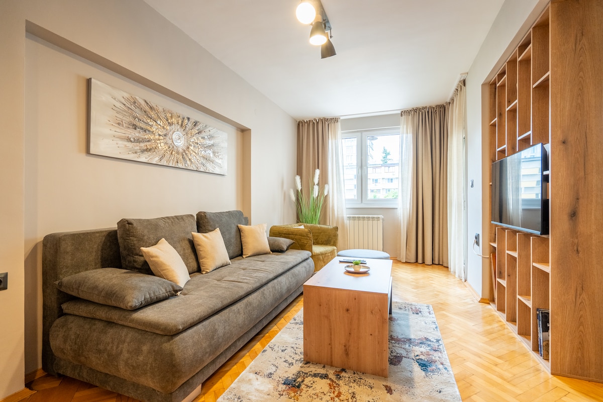 Zamieszkaj w tym nowo odnowionym, przestronnym mieszkaniu z 2 sypialniami, zaledwie kilka minut od centrum Sofii. Wygodne łóżka, jasny salon, jadalnia, w pełni wyposażona kuchnia i balkon z pięknym widokiem – to wszystko, czego potrzebujesz, aby się zrelaksować. Tylko 6 minut spacerem do metra „James Bourchier” i blisko Vitosha Blvd, zabytków, kawiarni i życia nocnego – idealne dla rodzin, przyjaciół lub osób podróżujących służbowo, które chcą zarówno komfortu, jak i wygody.