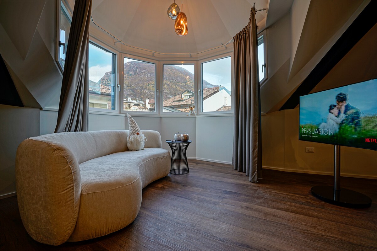 Dwupoziomowe mieszkanie z pięknymi oknami wykuszowymi w zabytkowym budynku w deptaku w centrum Bolzano. Mieszkanie znajduje się na najwyższym piętrze (z windą) i zostało niedawno całkowicie odnowione. Jest położony centralnie i cicho, zaledwie minutę spacerem (ok. 150 m) od Placu Walthera (centrum Bolzano). Widok na dachy i katedrę w Bolzano jest wyjątkowy. Z łóżka widać niebo i góry, a wieczorem rozgwieżdżone niebo.