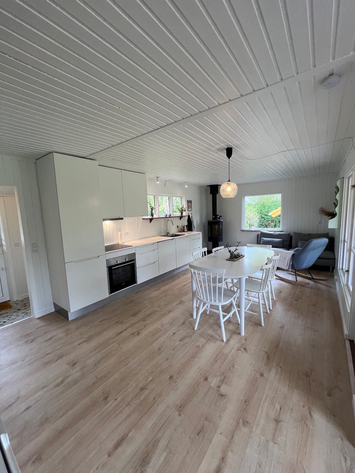 Domek o powierzchni około 80m2, położony jako ostatni dom na drodze. Dom znajduje się wysoko z pięknym widokiem. Salon z piecem opalanym drewnem (przynieś własne drewno opałowe). Kuchnia z kuchenką, lodówką, zamrażarką i zmywarką. 3 sypialnie (1 łóżko podwójne (160x200), 2 pojedyncze łóżka (80x200), 2 pojedyncze łóżka (75x150 +75 i 75x180), jedno tylko dla dzieci) Rozkładana sofa w salonie (90 x 200) Łazienka z prysznicem. Dodatkowa lodówka w dużej szopie. Ogród z tarasami, zadaszonym tarasem, piaskownicą. Meble ogrodowe. Opłata za energię elektryczną.