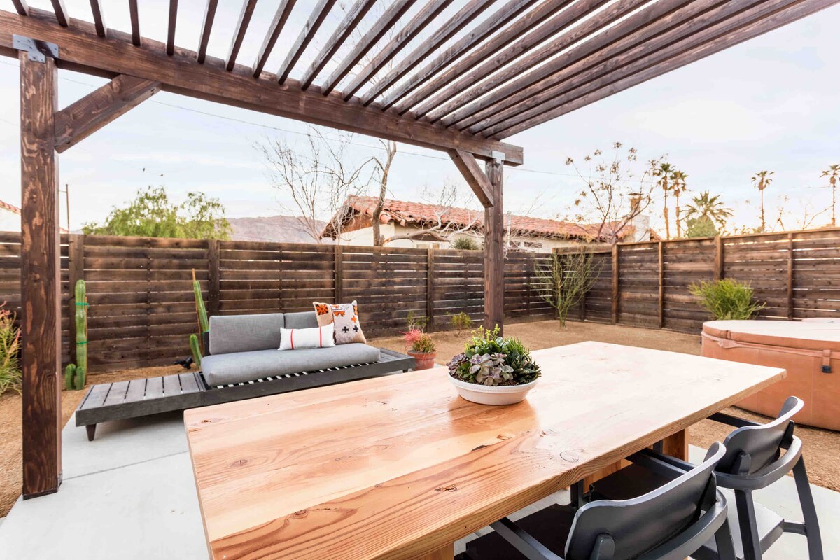 Welcome to Mockingbird Villa—a midcentury oasis located between Palm Springs and Joshua Tree. Located just a stone’s throw from Big Morongo Canyon Preserve, this dreamy hideaway offers a front row seat to 200+ species of migrating birds plus rabbits, squirrels and butterflies. Nestled on the hillside surrounded by a garden of cacti and succulents, guests can escape the cold, bustling city to enjoy morning sunrises sipping coffee on the patio and crisp evenings stargazing in the hot tub.