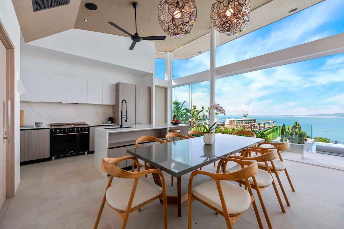 Panoramiczne widoki na morze i zachód słońca z każdego pokoju. Prywatny basen infinity o długości 12 metrów. 5 minut spacerem do prywatnej plaży. Ogrodzona luksusowa posiadłość w Thongson Bay na Samui. 4 sypialnie · 3,5 łazienki · Maksymalnie 8 gości ★Kino domowe 90′ ★ 3 strefy do pracy z monitorami i widokiem na morze – idealne do pracy zdalnej ★ Bieżnia, fotel do masażu, trampolina ★W pełni wyposażona kuchnia ze zmywarką, piekarnikiem i ekspresem do kawy Prysznic ★na zewnątrz ★Pralko-suszarka ·Grill gazowy ★ Utrzymanie basenu i ogrodu w cenie ★ Posiadłość przy plaży z basenem + dostęp do prywatnej plaży ★Bezpłatny parking