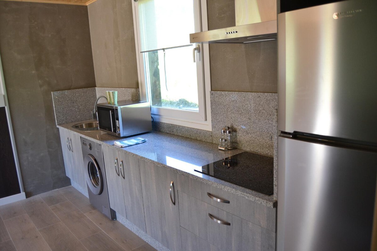 Apartament klimatyzowany dla osób niepełnosprawnych, z dwiema sypialniami, pełnym salonem - kuchnia i łazienka z toaletą. W wiosce liczącej 20 osób na wysokości 760 metrów nad poziomem morza, z pięknym widokiem na Sierra de San Mamed. Otoczenie jest bardzo ciche i wiejskie, co zachęca do odosobnienia się i korzystania z uroków natury. Samodzielnie skonstruowaliśmy kompleks 6 apartamentów turystycznych, wykorzystujących ponownie używane kontenery.