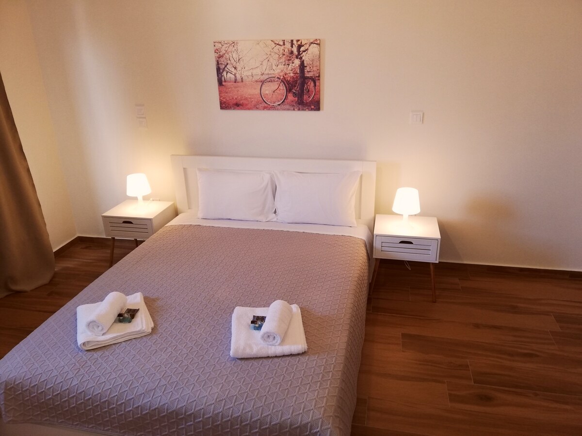A apartment including 2 bedrooms, a bathroom, and a big living room with a kitchen and a very comftable balcony and courtyard. There is also a free parking. Our house is 10 minutes away from the airoport, 2 minutes away to the supermarket and to the bakery . A 5 minutes walk to Pizza Fun and to Traditional Greek food souvlaki.