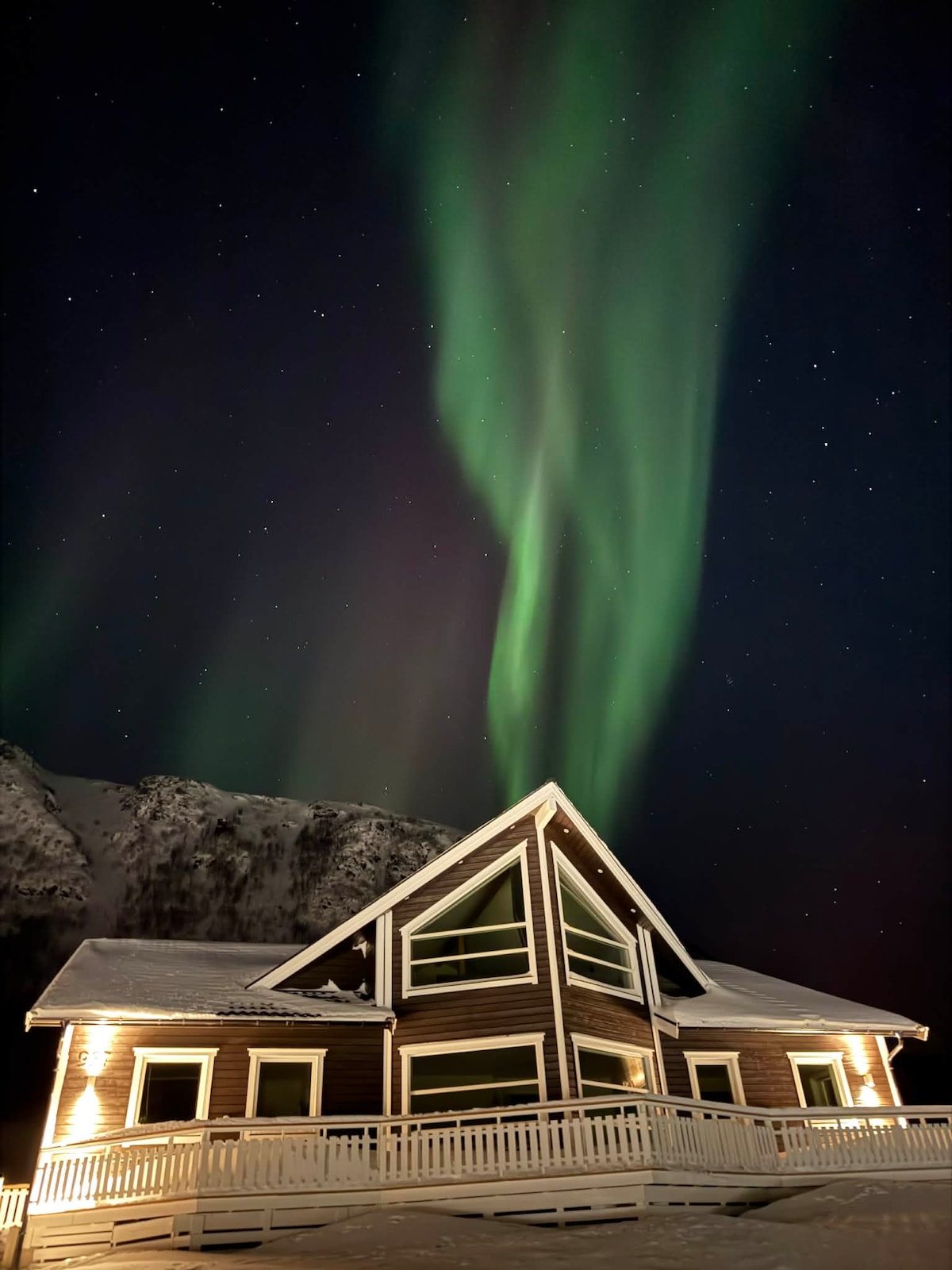 Wspaniała chatka z widokiem na góry, morze i zorzę polarną