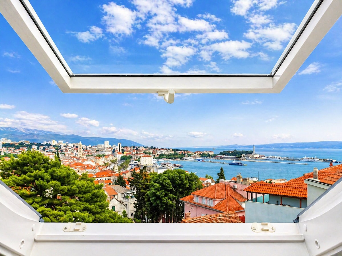 Uroczy apartament na poddaszu na szczycie Varoš, tuż pod punktem widokowym Vidilica, oferuje spektakularne widoki na miasto i morze, wschody słońca i rozgwieżdżone niebo przez panoramiczne okna dachowe. Spokojne spacery po lesie Marjan zaczynają się tuż za progiem, a Stare Miasto w Splicie jest oddalone o niecałe 10 minut spacerem. Prywatny zamykany parking wliczony w cenę. Apartament jest idealny dla par, osób pracujących zdalnie i gości planujących dłuższe pobyty, którzy szukają komfortu, spokojnego otoczenia i jednej z najpiękniejszych lokalizacji w Splicie.