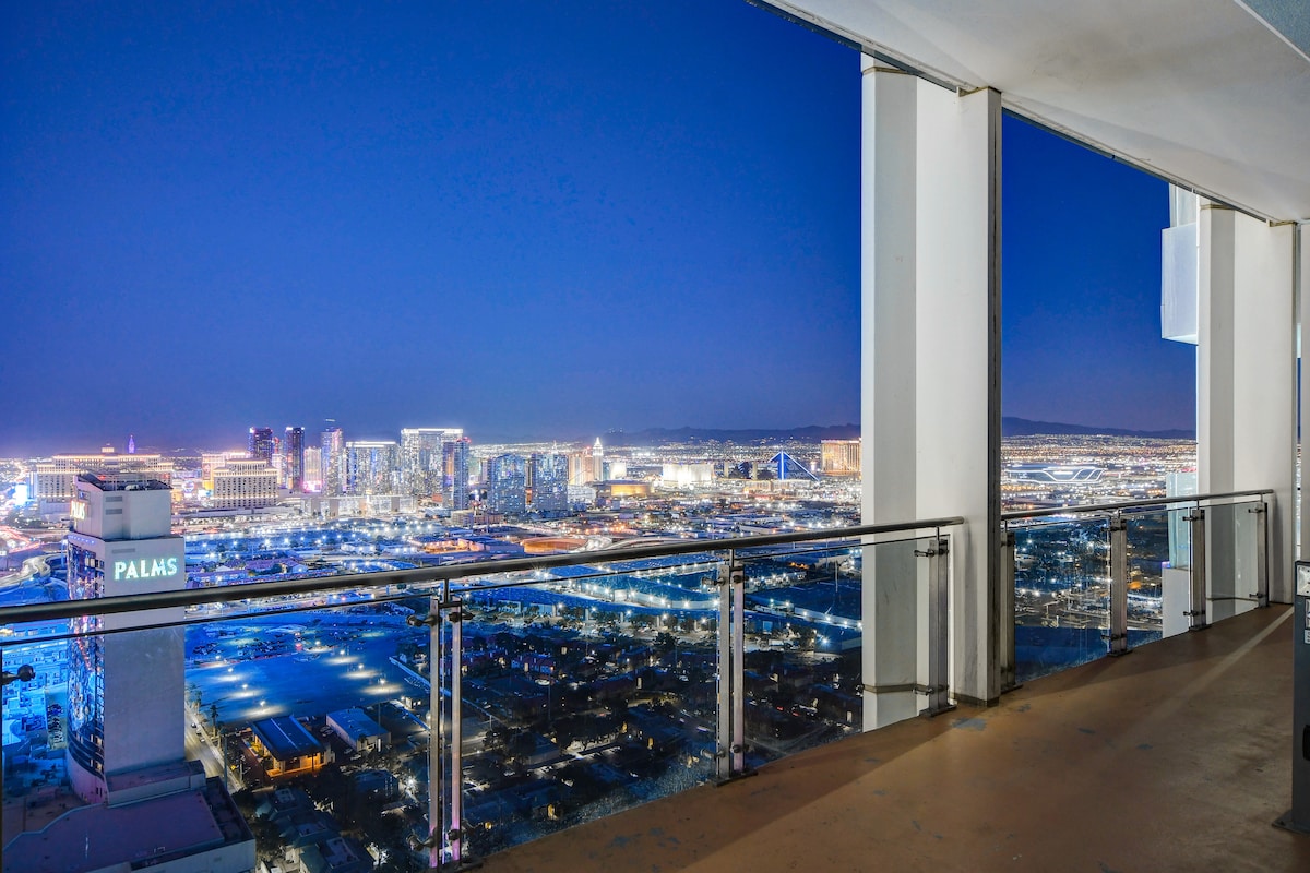 Zapierający dech w piersiach widok na Las Vegas Strip z Palms Place (należącego do A Palms Casino). Ta nieruchomość oferuje przestronną konfigurację apartamentów dzielonych (apartament z 1 sypialnią + apartament typu studio o łącznej powierzchni 173 m²). Ten ultranowoczesny apartament oferuje czarny stół bilardowy ze stali nierdzewnej, pełnowymiarowy salon gier retro z lat 80-tych i wannę z jacuzzi w sypialni z widokiem na pas. Okna od podłogi do sufitu, automatyczne żaluzje i duży balkon z oszałamiającym widokiem na cały Las Vegas Strip