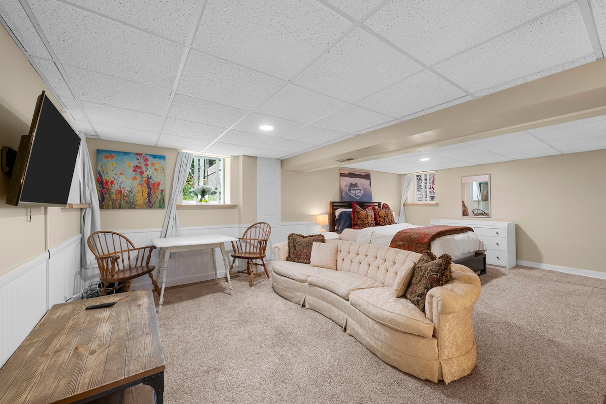 Anni's Attic: przytulna, łazienka z prywatnym balkonem (z widokiem na nasze duże podwórko i patio z bukszpanem, z którego goście mogą korzystać), aneks kuchenny, pralnia, oddzielna część dzienna z kominkiem gazowym i miejscem do pracy z widokiem na krajobraz – wszystko to 20 minut od najlepszych atrakcji. Wejście z boku prowadzi do alejki pełnej dzikich kwiatów, owoców i warzyw ze Środkowego Zachodu – ulubionych przez zapylacze wiosną/latem i ptaki przez cały rok. Niestandardowe obrazy w przestrzeni od gospodarza.