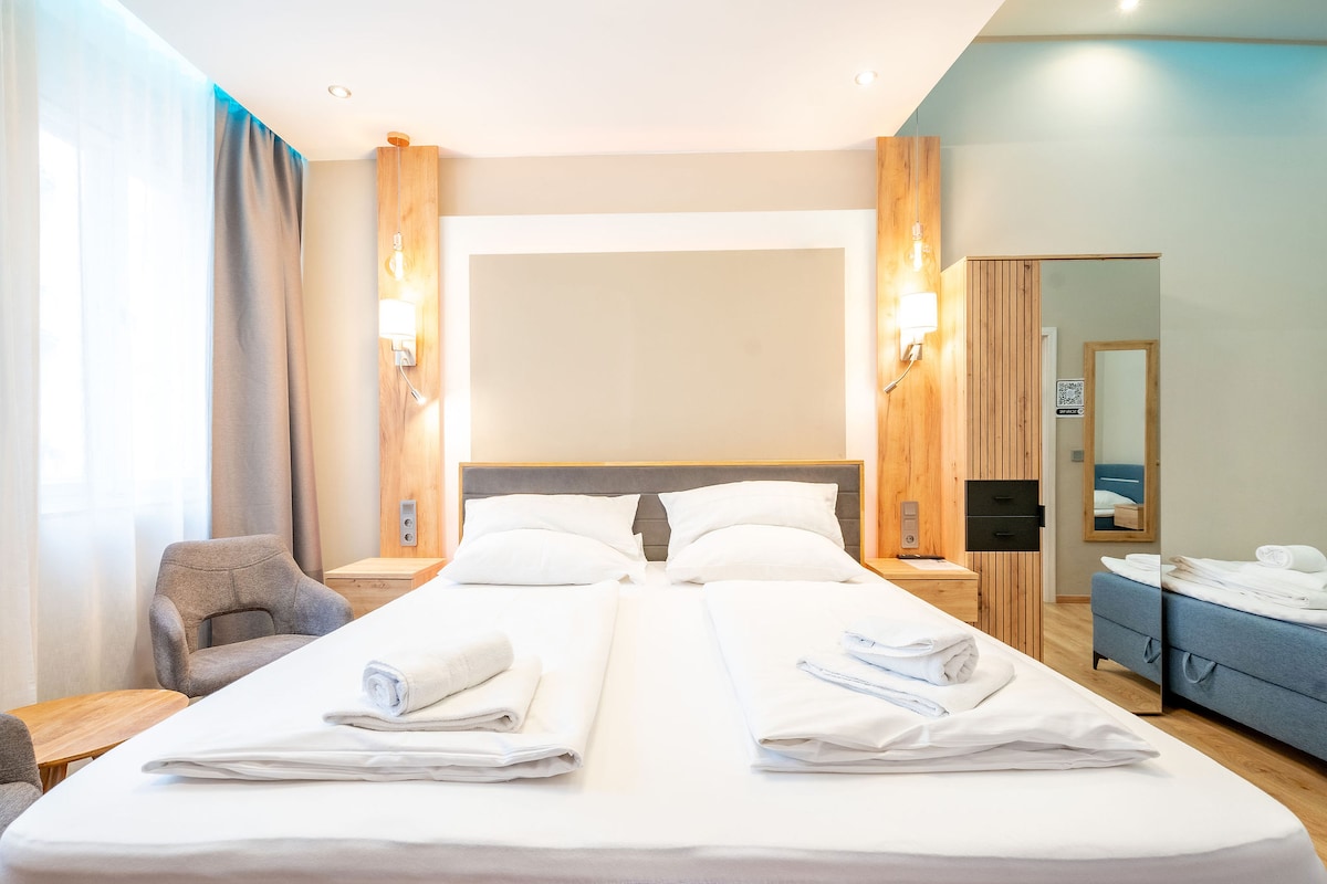 Gotowi do startu? Dla wszystkich pionierów i poszukiwaczy przygód przygotowaliśmy łóżko odkrywcy. Wyrusz w własną wiedeńską przygodę. Ten cichy pokój oferuje wszystko, czego potrzebujesz: przeszklony prysznic z deszczownicą, puszyste ręczniki i pościel wysokiej jakości, odpowiedzialnie pozyskiwany żel pod prysznic i szampon, mega-watową suszarkę do włosów, telewizor z płaskim ekranem, mobilne biurko i krzesło oraz oddzielną toaletę.