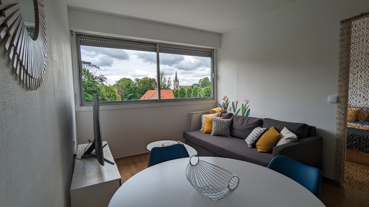 Wynajem apartamentu w historycznym centrum Valenciennes w pobliżu Pałacu. Powierzchnia 40 m² Na parterze Mieszkanie odnowione w 2021 roku. Starannie urządzony Urocze studio W pobliżu muzeum, targ, życie nocne, ogród Rhônelle. - Wyposażona kuchnia - Pralka i suszarka - Prysznic włoski - Oddzielne toalety - Przestronna sypialnia na antresoli z telewizorem. - Łóżko Simmons 140 x 190 - Salon z telewizorem - Internet / telewizja Smart TV Płatny parking na ulicy.