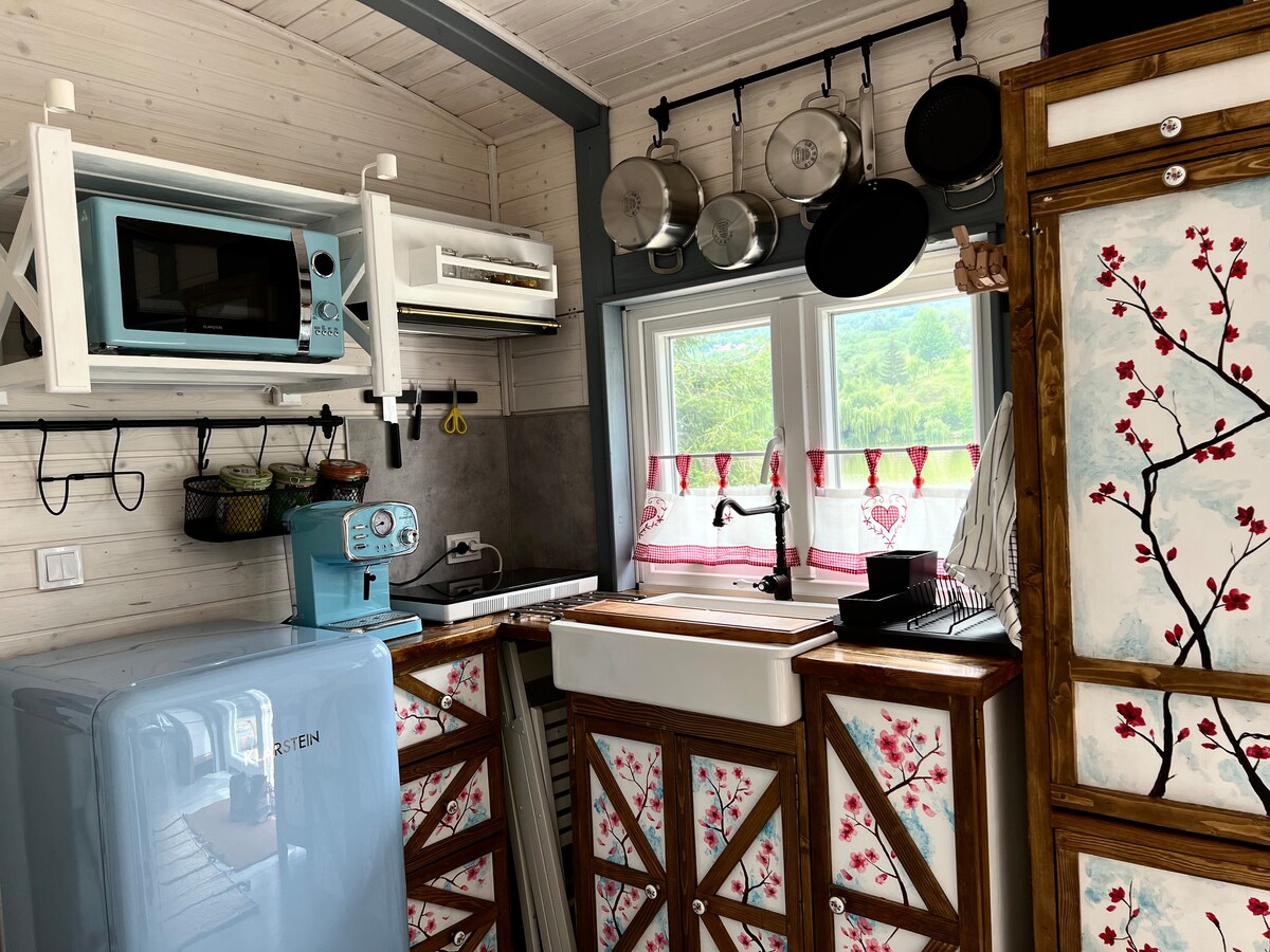 The cabin is located in a remote quiet place, perfect for nature lovers. It was built in a tree and has a view over the Southern part of the Făgăraș Mountains. We have no electricity but but we have a solar photovoltaic system. We have no running water, no bathroom, but we have a composting toilet and a shared shower so you can feel closer to nature. You can make a barbeque, a camp fire, relax in the hammock take long walks and enjoy the silence. Our pets will be more than happy to play with you