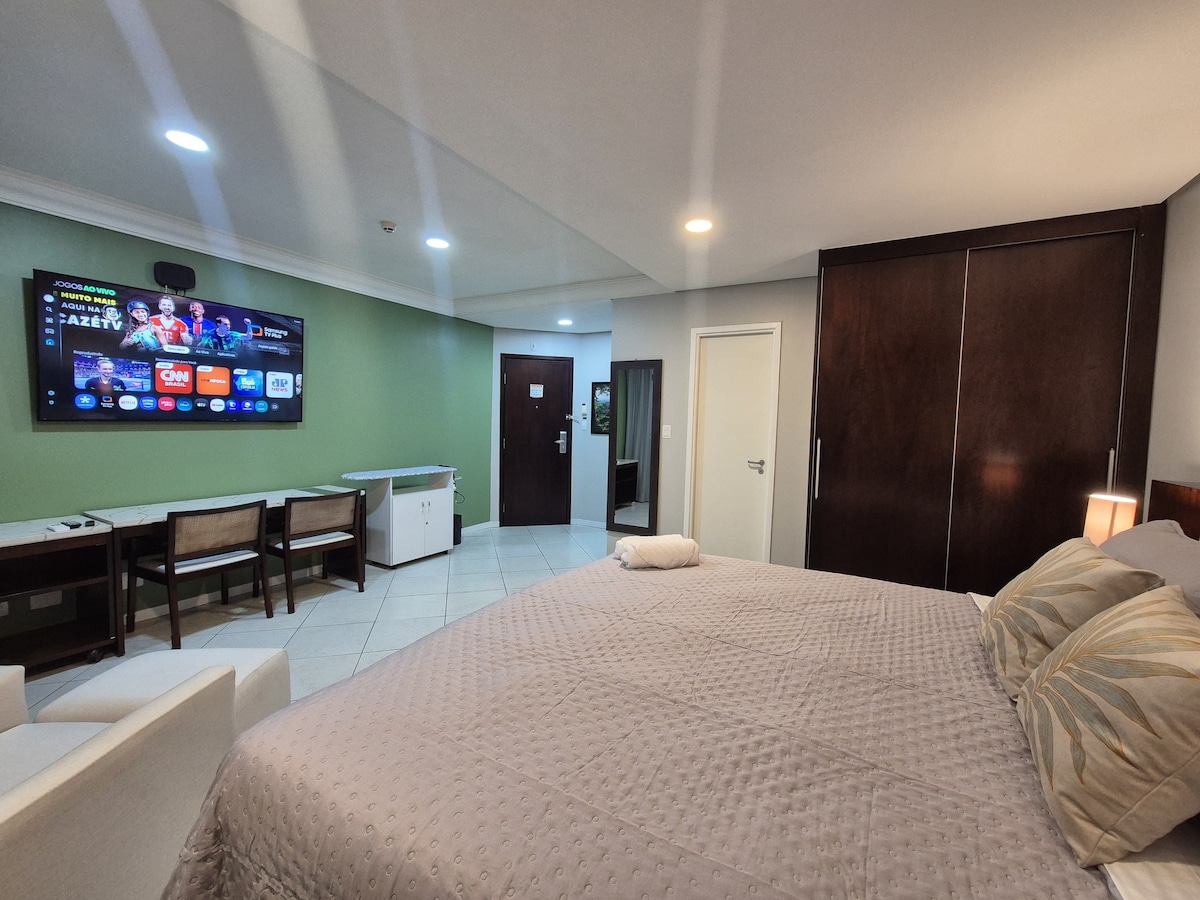 Mieszkanie z widokiem na Rio Negro. Ciesz się kompletną strukturą hotelu i najlepszą lokalizacją turystyczną w Manaus. Idealne dla tych, którzy chcą się zrelaksować, odkryć wycieczki i przeżyć niezapomniane chwile w Amazonii! Idealne dla turystów, którzy cenią sobie wygodę, dobrą lokalizację , nie rezygnując z komfortowego łóżka typu king-size, klimatyzacji, sofy na pocztówce z prawdziwego miasta. Przyjdź i ciesz się Manausem, na który zasługujesz !