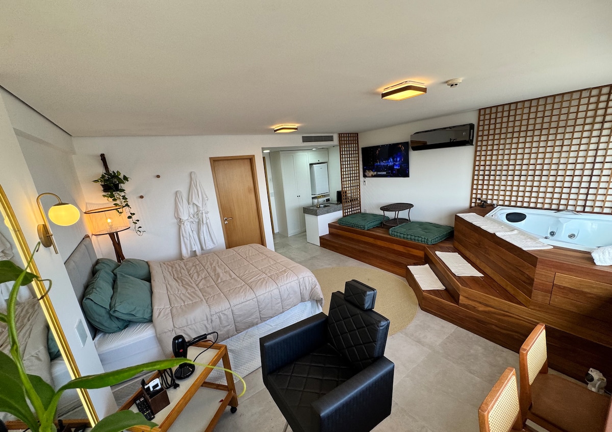 Studio w Marulhos Suites Resort. Łóżko typu queen, łóżko pojedyncze, dodatkowy materac, klimatyzacja, dobre łącze internetowe i telewizor Smart TV. W kuchni znajduje się lodówka, lodówka na wodę, ekspres do kawy, opiekacz do kanapek i inne przybory kuchenne. Przytulne mieszkanie z widokiem na baseny. Hotel jest pierwszorzędny, posiada kilka basenów, saunę, siłownię, boiska do piłki nożnej i korty tenisowe, plac zabaw i codzienną rekreację dla dzieci. Od kilku lat wynajmuję to i inne mieszkania w Muro Alto, więc możesz mi zaufać!