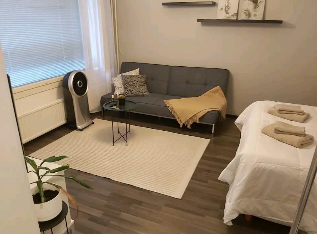 Ładne, czyste studio z przeszklonym balkonem około 3 km od centrum miasta i dworca kolejowego. Zatrzymaj się w tym popularnym miejscu w ruchne letnie weekendy (np. Provinssi, Tangomarkkinat). Możesz tu również zadomowić się na dłuższy czas, na przykład w dni pracy lub nauki. Jedna osoba widzi nieciekawe otoczenie, a druga – oszałamiające tereny do biegania. K-market i przystanek autobusowy w pobliżu. Zrelaksuj się w tym spokojnym i wygodnym miejscu 😊