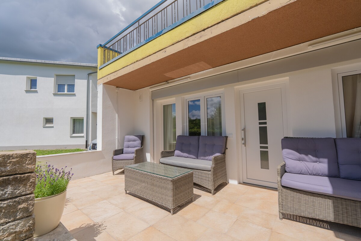 Nowocześnie urządzony, jasny, słoneczny i o powierzchni 75 m²: nasz trzypokojowy apartament na pierwszym piętrze naszego czterorodzinnego domu oferuje dużo miejsca na wakacyjne marzenia. Duża kuchnia na planie otwartym ze zmywarką, lodówką z zamrażarką, a także telewizor i Wi-Fi zapewniają wszelkie wygody. Sypialnia wyposażona jest w wygodne podwójne łóżko (sprężynowe) i ma własny dostęp do tarasu. Ofertę uzupełnia oddzielny pokój dziecięcy z wysuwanym łóżkiem i toaleta z przestronnym prysznicem.
