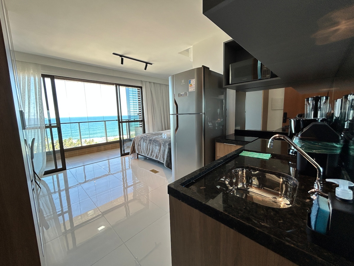 Studio com vista lindíssima para o mar com: piscina e academia no rooftop, quarto sala e varanda, wi-fi e estacionamento rotativo. Acesso fácil e rápido a praia. Ideal para 2 pessoas Fornecemos: Roupas de cama e toalhas de banho Áreas comuns do prédio: Academia Coworking Bicicletário Lavanderia Algumas distâncias: 7,5km Aeroporto 250m Praia Pedra do Sal 1,3km Hipermercado 28km Pelourinho Panelas e talheres 30km Igreja do Bomfim Cozinha temos: Microondas Cafeteira Liquidificador Air fryer