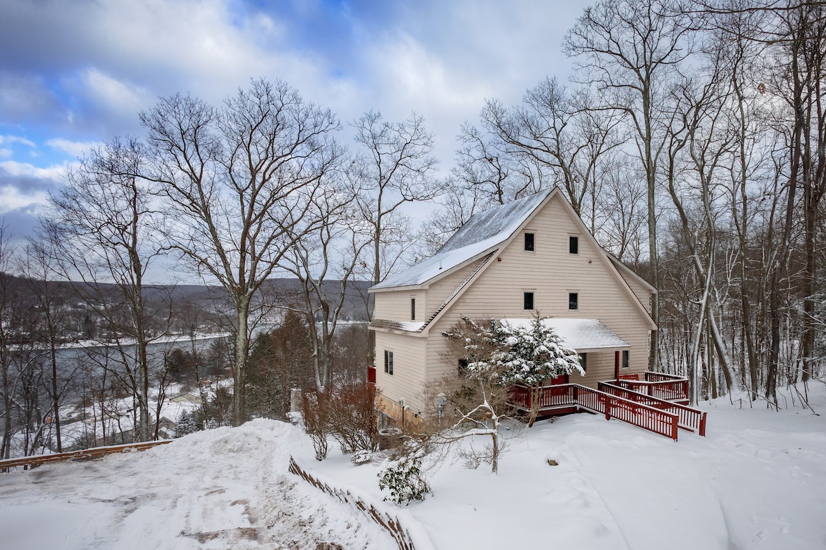 Ucieknij od codzienności! Nasz dom oferuje cztery duże apartamenty, dwa przestronne pokoje rodzinne, widoki na jezioro z podwyższonego tarasu i slip dla łodzi. Zwierzęta mile widziane! Położony na zalesionym zboczu wzgórza, pokochasz uczucie odosobnienia, a jednocześnie będziesz w centrum wszystkich działań DCL. Oferujemy nową kuchnię i wygodne wyposażenie domu, które zachęca do relaksu. Zbierz się wokół kominka, zrelaksuj się w jacuzzi, wejdź na pokład lub wyjdź na zewnątrz i ciesz się świeżym górskim powietrzem!
