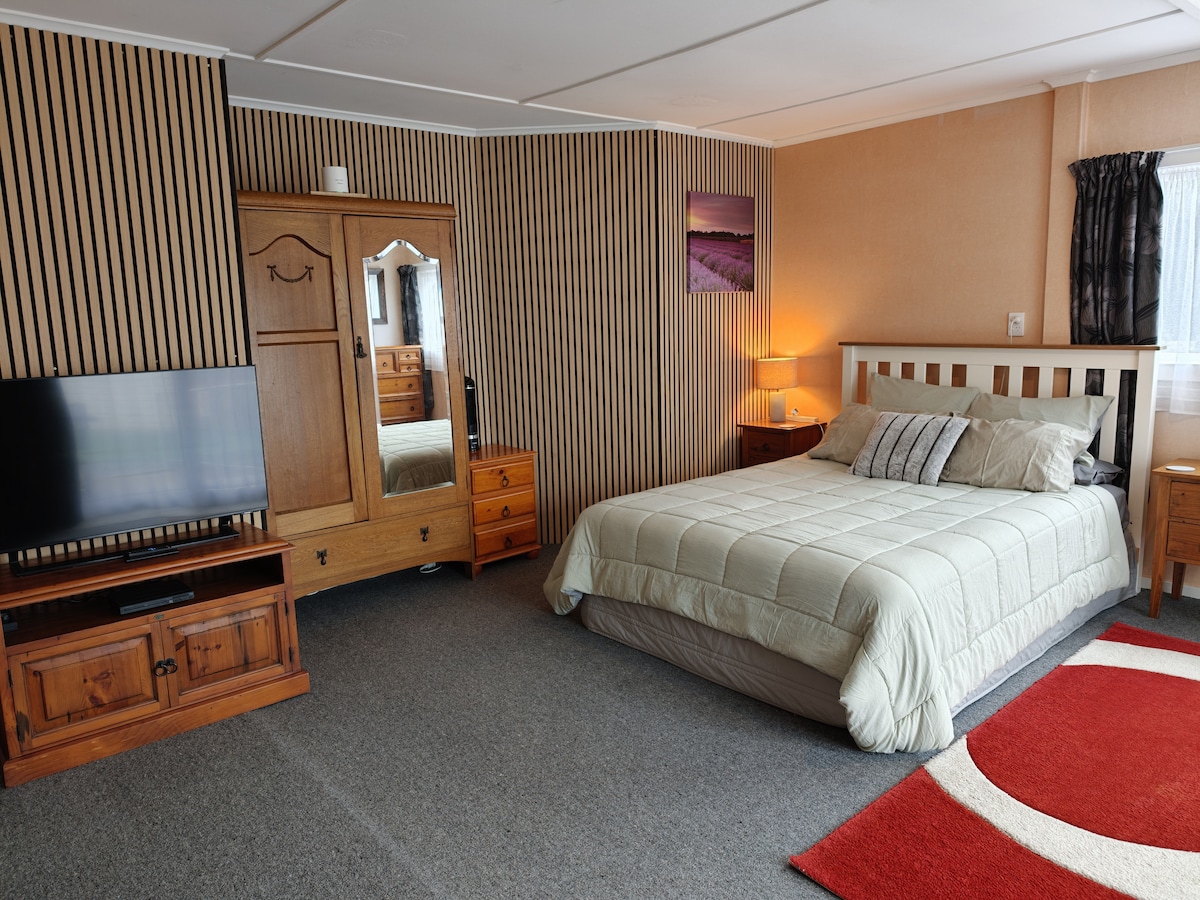 very close to Mt Taranaki and Stratford town, peaceful, private, warm and relaxing, In the room you will enjoy TV , WIFI internet unlimited , big lazy boy for your relaxing . Milk ,Tea ,sugar, coffee and Cereal breakfast provide for a night stay , microwave , Shampoo, conditioner, body wash, hand wash ,End of your stay Just keep the room tidy that will be appreciate. If stay longer we are supply cleaning products extra bedding,and bath towel. We will leave you in privacy.