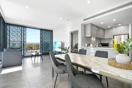 Ten nowy, stylowy apartament oferuje widok na Sydney Harbour Bridge. W każdym pokoju znajdują się wygodne i przestronie meble oraz łóżka typu queen-size, które zapewniają domową atmosferę. Bezpłatna siłownia na dole pomaga zachować formę podczas podróży. Doskonała lokalizacja oferuje doskonałe pobliskie restauracje, sklepy (DFO) i placówki medyczne, wszystko w odległości 2–3 minut spacerem. W 7 minuty spacerem można dotrzeć do stacji kolejowej, w pobliżu znajduje się stadion olimpijski i centrum wodne, a w 18 minut można dojechać do lotniska w Sydney.