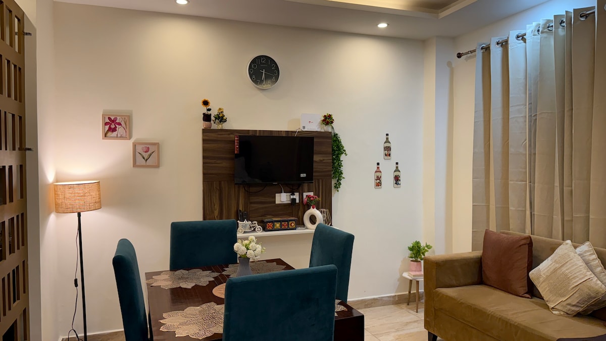 Ta otwarta kawalerka jest zgodna z minimalistycznymi zasadami projektowania. Wyposażone w aneks kuchenny, dwie łazienki, pełnowymiarowe łóżko typu King, łóżko ścienne typu Queen, telewizor z Netflix, Hotstar, PrimeVideo, JioCinema i bezpłatne Wi-Fi, to miejsce może wygodnie pomieścić czteroosobową rodzinę. UWAGA: jest to apartament na planie otwartym i nie ma prywatnych sypialni, apartament znajduje się na drugim piętrze, więc trzeba wejść po schodach na dwa piętra. ZAKAZ IMPREZ 🙏🏽 i PALENIA 🚭