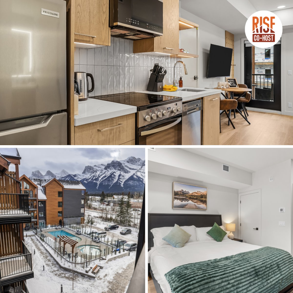 * System klimatyzacji, * Wspaniały widok na góry z najwyższego piętra z prywatnym tarasem * Całoroczny podgrzewany basen na śwież powietrzu i jacuzzi * Bezpłatny, podgrzewany parking wewnętrzny * Siłownia * Całodobowa recepcja *W pełni wyposażona kuchnia ze wszystkimi przyborami *15 minut do Banff, 45 minut do Lake Louise, 8 minut spacerem do centrum Canmore. ***Idealne dla 2 osób dorosłych Idealne na długi pobyt😀