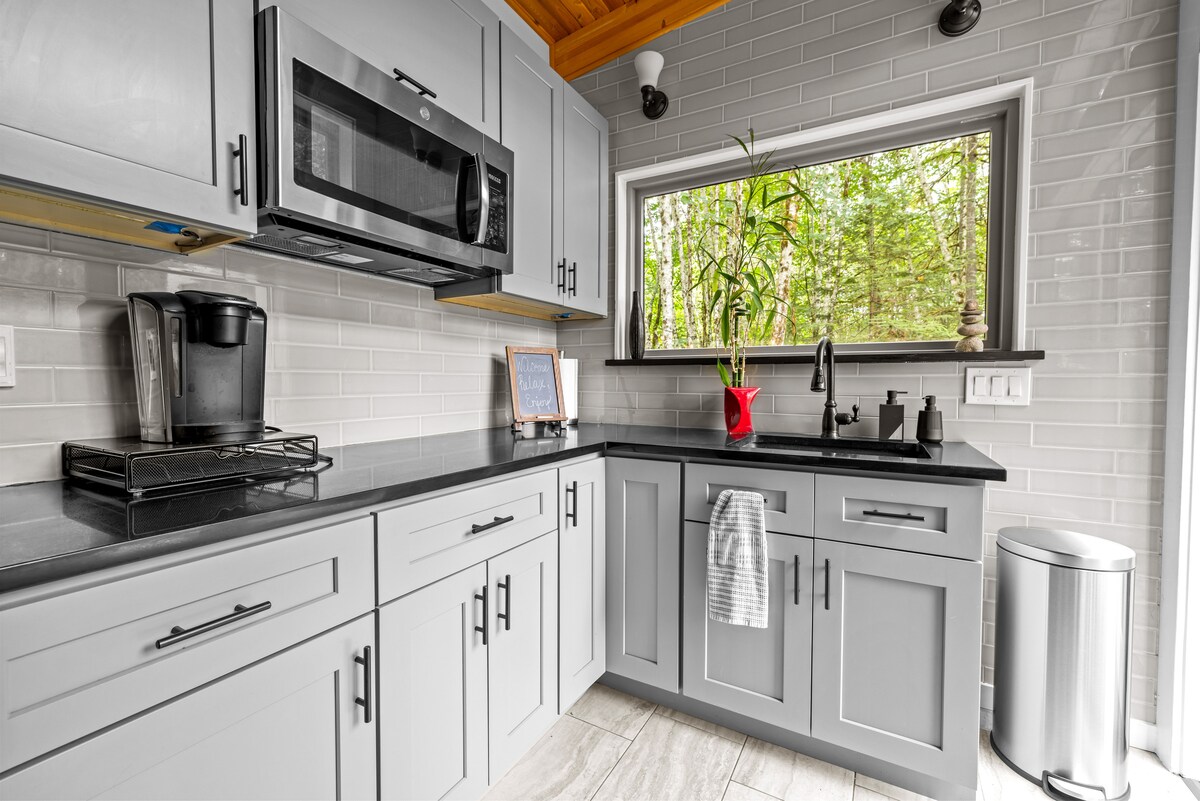 Zrelaksuj się i ciesz się pięknymi wiosennymi i letnimi zmianami z własnego prywatnego tarasu przy apartamencie. Ciesz się pięknym widokiem. Zaktualizowaliśmy nasze WiFi do systemu mesh, który działa świetnie. Apartament ma około 750 stóp kwadratowych, oddzielną sypialnię, salon i mini kuchnię nad garażem z prywatnym wejściem. Jest tu przedpokój, w którym można zdjąć buty i płaszcze przed wejściem po schodach. Ciesz się widokiem na Eld Inlet w spokojnej, leśnej okolicy. Niedawno postawiliśmy ekspres do kawy Keurig.