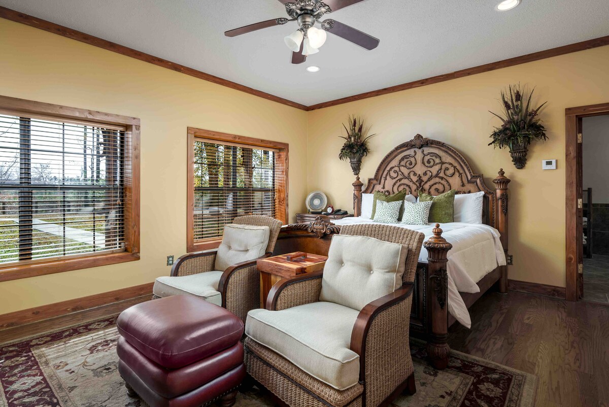 Zbudowany w 2015 roku i całkowicie odnowiony w 2021 roku z niestandardowymi elementami drewnianymi. Hunter's Retreat to oddzielny budynek około 50 jardów od zabytkowego, głównego domu i bezpośrednio bezpośrednio obok Cedar Guest Quarters. Popularne wśród gości z Uniwersytetu Alabama, nowożeńców, myśliwych i gwiazd rocka (nieruchomość może pomieścić autobusy wycieczkowe i pojazdy z przyczepą). Otoczony bezkresnymi terenami zapewniającymi prywatność i doświadczenie zarówno wewnątrz, jak i na zewnątrz!