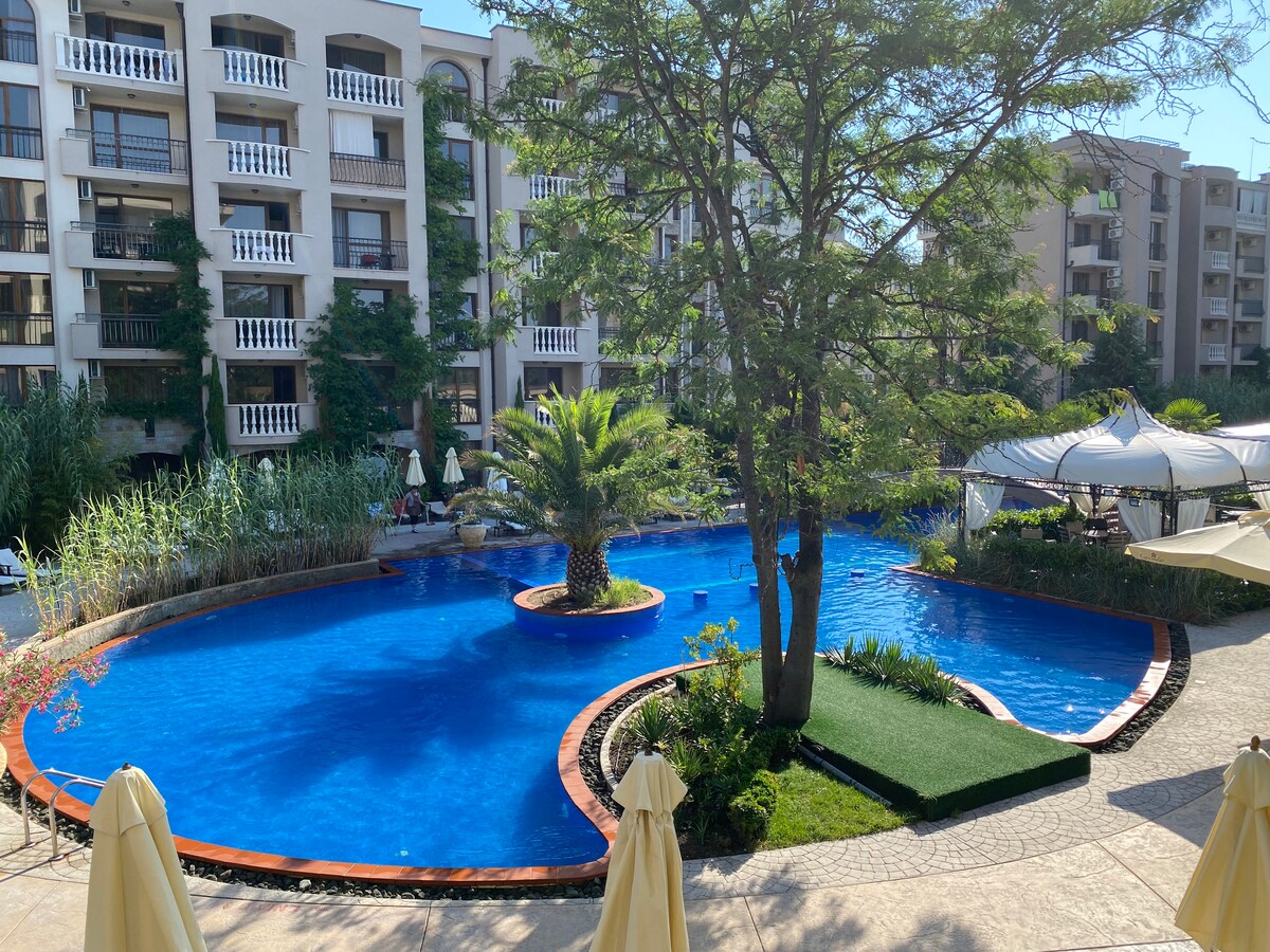 This spacious (45m2)studio is located in one of the most luxurious apartment complexes in Sunny Beach. The apartment is fully equipped and offers comfortable sleep for guests in a queen-size bed and spacious balcony overlooking to complex's main pool area. The complex also offers a jacuzzi, sun loungers, a gym, and a (paid) spa including a hot tub and sauna. It is located near to the main beach as well as a large supermarket and the Action Aquapark and many restaurants and bars.
