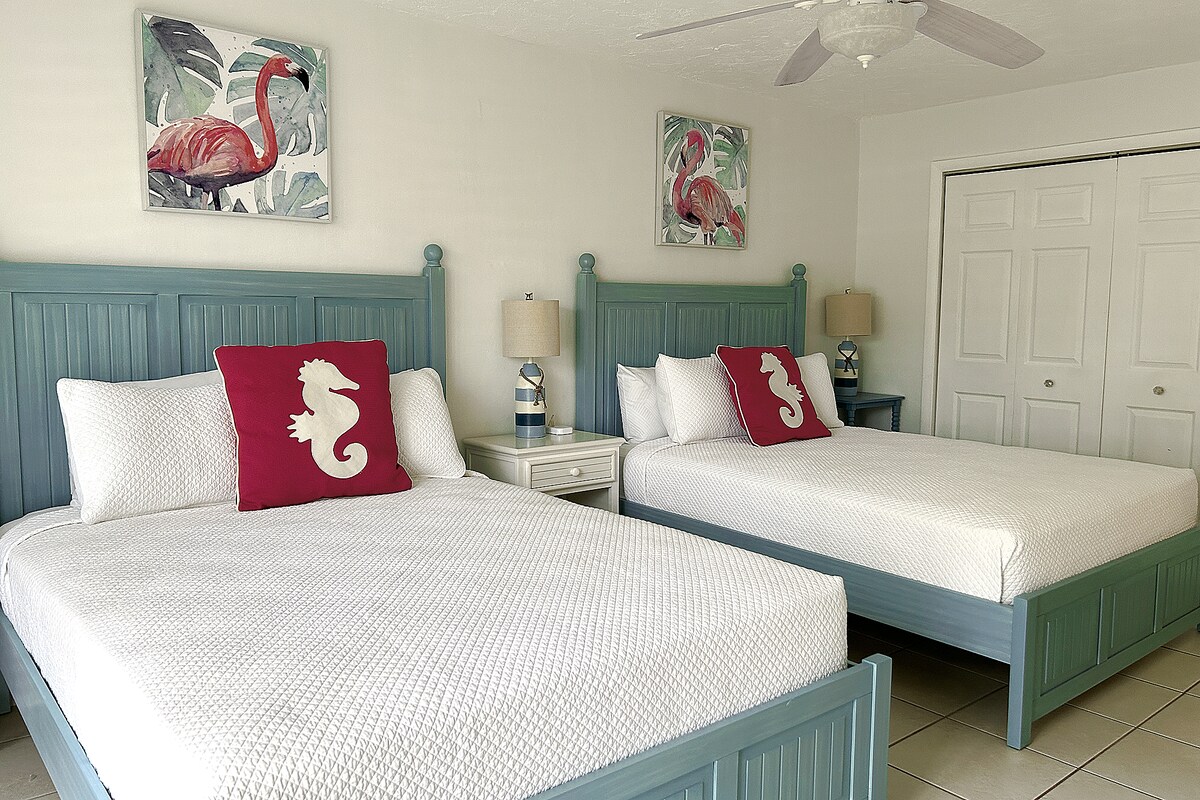 Parterowe mieszkanie z 2 sypialniami i 1 łazienką w Key Colony Beach. Kompleks nad oceanem z podgrzewanym basenem i prywatną białą piaszczystą plażą. Nowy remont z nowymi łóżkami, meblami i nową łazienką! Condo ma kuchnię wyposażoną we wszystko, czego potrzebujesz do gotowania i podawania kompletnych posiłków. Znajdziesz się w odległości 20 sekund spacerem od naszej prywatnej plaży i każdego ranka będziesz cieszyć się wspaniałymi wschodami słońca. Krzesła wypoczynkowe, stoły tarasowe, chatki tiki i grille dostępne dla gości. Przepraszamy, na naszym parkingu nie można parkować łodzi ani przyczep