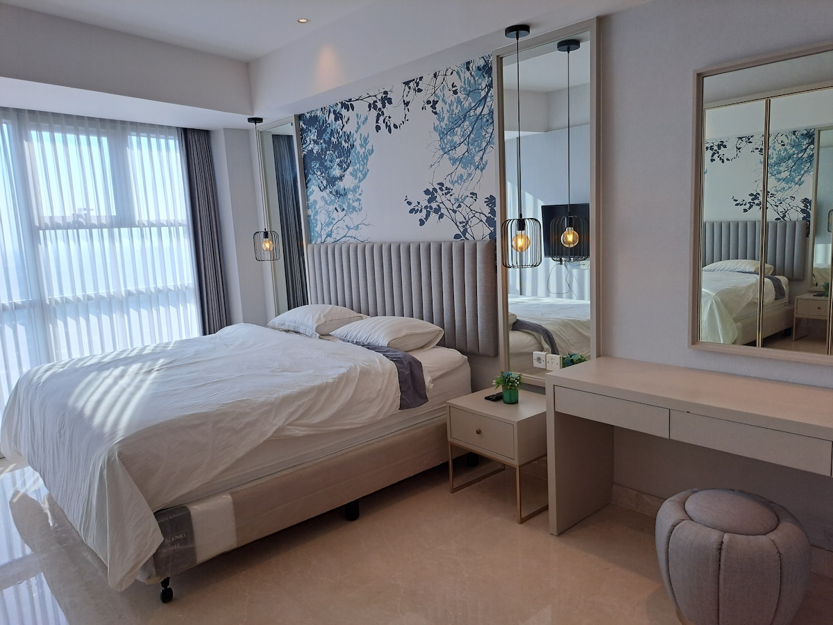Enjoy a stylish lifestyle in this brand new 2023 apartment, with direct access to the biggest mall in Indonesia, Pakuwon Mall. This luxury apartment is located in the LaViz building and has complete amenities such as gym, swimming pools, hot jacuzzi, rooftop garden, and a 24h concierge in the lobby. *Free parking is only available upon request for weekly/monthly stays. To request, please notify & message me at least 5 days in advance. I will need a photo of your STNK. Paid parking is available.