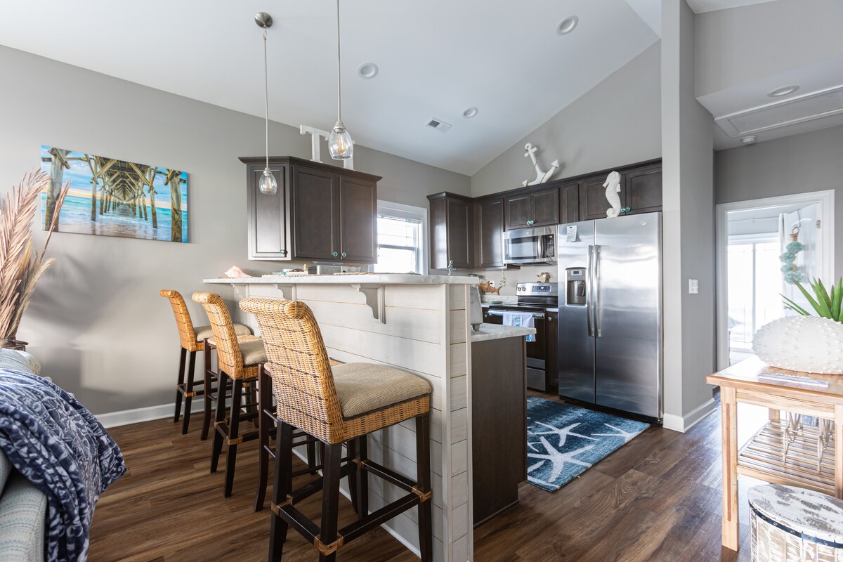 Przyjdź i weź swoją witaminę morską – słońce, świeże powietrze i słoną wodę! Uroczy apartament z 2 sypialniami i 1 łazienką z pięknymi widokami z prywatnego tarasu i przejściem bezpośrednio na plażę. Idealne dla singli, par lub małych rodzin. Spacer do najlepszych restauracji i sklepów w Surf City. Wszystko w odległości 5-10 minut spacerem. Łatwy dostęp do nowego wysokiego mostu. Wszystkie podłogi winylowe. Wszystkie pościele są wliczone w cenę. Dodatkowo pakiet gospodarstwa domowego, grill na węgiel drzewny i gazowy i nie tylko!